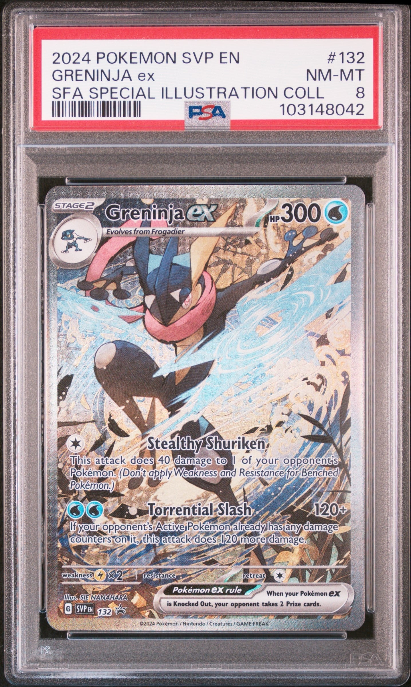 2024年8月2日に海外限定で『Special Illustration Collection』(以下SIC)に収録された浮世絵風のゲッコウガのプロモカードです。『Shrouded Fable(覆い隠された寓話)』というブースターパックと合わせて登場した製品です。ドドゲザン(Kingambit)21.99$、キングドラex(Kingdra ex)29.99$、ゲッコウガex(Greninjya ex)29.99$、という3種類が発売されたのですが、キングドラとゲッコウガが浮世絵風のイラストに仕上がっていて圧倒的にインパクトが凄すぎました。定価設定もそのインパクトに応じてつけられているような気がしてなりませんでしたね(笑)。海外版のカードも趣味の範囲で購入して開封を楽しんでいますが、日本語版と比較すると造りが粗く初期傷がとても多い気がします。
